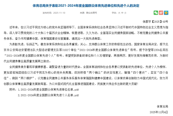 近日,国家体育总局公布“2021-2024全国群众体育先进单位、先进个...