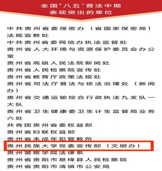 全国“八五”普法中期表现突出的单位(贵州民族大学获表彰截图)