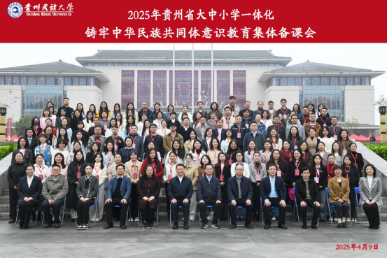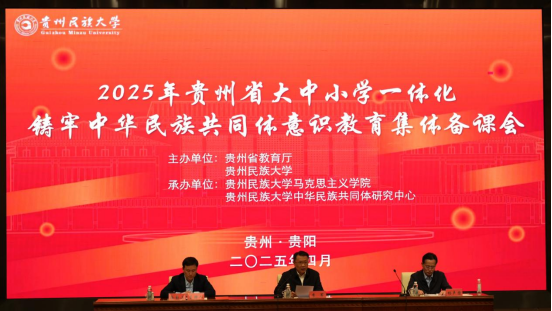 4月9号,2025年贵州省大中小学一体化铸牢中华民族共同体意识教育集体备课会在我校南校区图书馆一楼报告厅举行。省委教育工委副书记李军,校党委副书记杨声国,省委教育工委学生工作部部长、贵州省教育厅思想政治教育处处长王晓红出席会议。在筑大中小学校铸牢中华民族共同体意识课程教师代表共120余名参加会议。会议由我校马克思主义学院党委副书记徐勤山主持。
