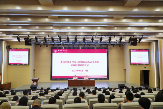 10月17日,贵州民族大学2025年教师综合素养提升专项培训开班仪式在南校区图书馆一楼学术报告厅举行。校党委常委、副校长汪红出席并讲话。青年教学骨干、岗前培训教师及近两年海外归国教师近200人参加。校党委教师工作部部长、人事处处长王恋主持。