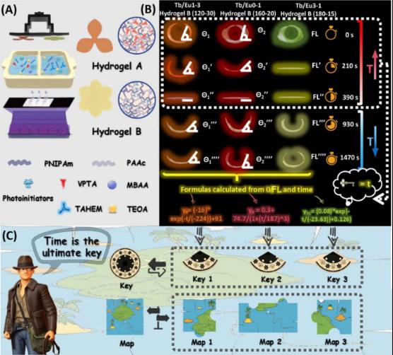该研究成功研制出两种类型的4D打印荧光水凝胶驱动器,它们具备仅受温度驱动的时间门控分级变形和变色双重功能,这对于满足高级加密和防伪保护日益增长的需求至关重要。具体而言,水凝胶A的目标开花状态,通过调节不同参数打印的花瓣实现分级变形,同时配合365 nm紫外光照射,实现分级荧光颜色转换(由橙色变为蓝色),从而同步达成预期效果;在254 nm紫外线照射下,不同稀土离子掺杂的水凝胶B在开花和闭合构型之间表现出可逆的分级状态转换,并伴随着动态多色荧光调制。以上水凝胶的分级变形均源自可见光固化3D打印技术精确构建的空间梯度交联网络,以及特别设计的荧光发色团。这两者共同作用,使得荧光水凝胶在热激活下能够实现“形状变形-多色荧光-信息加密”的一体化刺激响应。因此,通过动态调整弯曲角度和荧光比,可以利用这些4D打印荧光水凝胶开发出一种独特的“密码本”——一种基于时间依赖的双参数加密系统,从而有效实现高安全性的时空信息保护。时间门控形状转换与多色荧光集成衍生出的多维度信息保护机制,显著提升了信息加密技术的复杂性。4D打印荧光水凝胶驱动器的成功构建,使这种双模态时空加密策略得以实现,同时有效防止了未经授权的访问,开创了全新的信息安全存储方法。