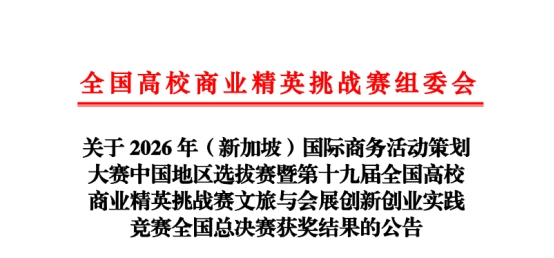 近日,2026 年 (新加坡) 国际商务活动策划大赛中国地区选拔赛暨第十九届全国高校商业精英挑战赛文旅与会展创新创业实践竞赛全国总决赛落下帷幕。我校 24 支参赛团队表现亮眼,共获得一等奖 2 项、二等奖 9 项、三等奖 13 项。学校荣获 “最佳院校组织奖”,尽显我校文旅与会展领域创新创业教育的扎实成果。
