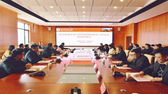 12月19日,贵州民族大学科技园首批拟入驻企业项目路演对接会在南校区举办。校党委常委、副校长徐国敏、龚维出席,校内外相关领域专家组成评审组参会。会议由大学生创新创业指导中心主任王长城主持。